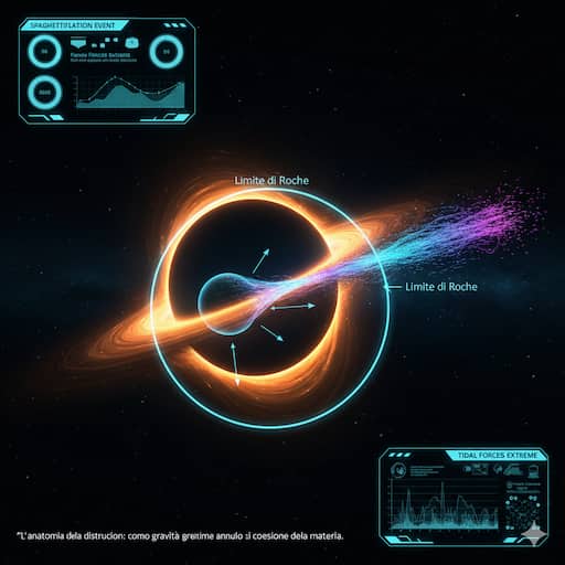 Per visualizzare meglio questo concetto, osserviamo cosa succede quando una stella si avvicina troppo a un buco nero. Questo evento astronomico è noto come “Evento di Distruzione Mareale” (TDE). Quando la stella entra nel raggio d’azione delle forze di marea del buco nero, non viene inghiottita intera. Invece, la gravità del mostro oscuro strappa i gas esterni della stella e li allunga in lunghi filamenti luminosi che orbitano attorno all’abisso prima di precipitare. Questo processo libera una quantità immensa di energia sotto forma di raggi X e luce visibile, permettendo ai nostri telescopi di individuare buchi neri altrimenti invisibili. È la spaghettificazione su scala macroscopica, un atto di cannibalismo cosmico di bellezza terrificante.