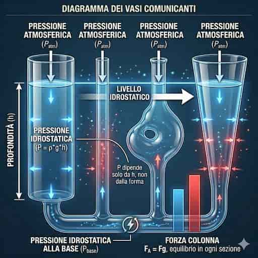 Il funzionamento dei vasi comunicanti si fonda sulla legge di Stevino, la quale stabilisce che la pressione dipende solo dalla profondità. In un sistema di contenitori aperti, la pressione atmosferica agisce uniformemente su tutte le superfici libere del liquido contenuto. Poiché il fluido è a riposo, la pressione alla base di ogni colonna deve essere identica per evitare spostamenti di massa interna. Di conseguenza, il liquido si distribuisce fino a quando le altezze delle colonne non generano pressioni uguali sul fondo comune del sistema.